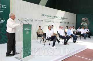 CHILAPA DE ÁLVAREZ, GUERRERO, 16JULIO2021.- Andrés Manuel López Obrador, Presidente Constitucional de los Estados Unidos Mexicanos presidió la presentación de los Programas para el Bienestar en la Unidad Deportiva Chilapa. Lo acompañaron Ariadna Montiel Reyes, Subsecretaria de Bienestar; Pamela López Ruiz, Directora General del Programa La Escuela es Nuestra; Carlos Torres Rosas, Secretario Técnico del Gabinete de la Oficina de la Presidencia; Marath Bolaños López, Subsecretario de Empleo y Productividad Laboral de la Secretaría del Trabajo y Previsión Social; Héctor Antonio Astudillo Flores, Gobernador Constitucional del Estado de Guerrero; Adelfo Regino Montes, Director General del Instituto Nacional de los Pueblos Indígenas; Victoria Rodríguez Ceja, Subsecretaria de Egresos de la Secretaría de Hacienda y Crédito Público; Javier May Rodríguez, Secretario de Bienestar; Abraham Vázquez Piceno, Coordinador Nacional del Programa de Becas para el Bienestar Benito Juárez; Hugo Raúl Paulin Hernández. Subsecretario de Inclusión Productiva y Desarrollo Rural y Esteban García García, Presidente Municipal de Chilapa de Álvarez, Guerrero. FOTO: PRESIDENCIA /CUARTOSCURO.COM