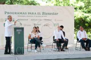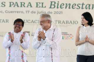 OMETEPEC, GUERRERO, 17JULIO2021.- Andrés Manuel López Obrador, presidente de México, presidió el evento protocolario "Programas para el Bienestar en Ometepec, Guerrero". Lo acompañaron: Ariadna Montiel Reyes, Subsecretaria de Bienestar; Pamela López Ruiz, Directora General del Programa La Escuela es Nuestra; Carlos Torres Rosas, Secretario Técnico del Gabinete de la Oficina de la Presidencia; Marath Bolaños López, Subsecretario de Empleo y Productividad Laboral; Héctor Antonio Astudillo Flores, Gobernador Constitucional del Estado de Guerrero; Adelfo Regino Montes, Director General del InstitutoNacional de los Pueblos Indígenas; Victoria Rodríguez Ceja, Subsecretaria de Egresos de la Secretaría de Hacienda y Crédito Público; Javier May Rodríguez, Secretario de Bienestar; Abraham Vázquez Piceno, Coordinador Nacional del Programa de Becas para el Bienestar Benito Juárez; Hugo Raúl Paulín Hernández. Subsecretario de Inclusión Productiva y Desarrollo Rural y Efrén Adame Montalván, Presidente Municipal de Ometepec, Guerrero. FOTO: PRESIDENCIA/CUARTOSCURO.COM