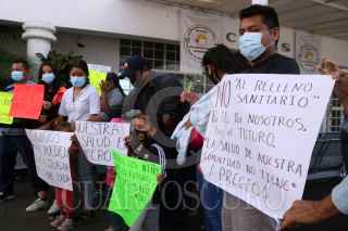 TEMIXCO, MORELOS, 19JULIO2021.- Habitantes de las comunidades de Santa Úrsula y de la Loma de Santa Clara protestaron en las oficinas del ayuntamiento de Temixco por la reactivación del funcionamiento del relleno sanitario de Loma de Mejía. Los vecinos dicen que sufren afectaciones a su salud desde el mes de enero que fue cuando se reinició la operación, denuncian que hay enjambres de moscas grandes, también que los camiones que trasladan los desechos derraman líquidos de olor fétido. En un recorrido por la zona se constató el tránsito de tráileres con basura que derraman líquidos a su paso, y también el funcionamiento del relleno sanitario, ubicado entre dos barrancas que comienzan a verse afectadas. El relleno sanitario de Loma de Mejía fue clausurado en el 2010 luego de una férrea oposición de vecinos de Cuernavaca. FOTO: MARGARITO PÉREZ RETANA / CUARTOSCURO.COM