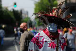 CIUDAD DE MÉXICO, 21AGOSTO2021.- Un hombre vestido con indumentaria típica Huichol camina por las calles del Centro Histórico de la capital durante la mañana de este miércoles. FOTO: DANIEL AUGUSTO /CUARTOSCURO.COM