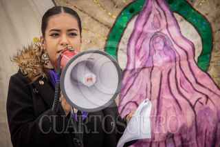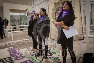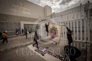 QUERÉTARO, QUERÉTARO, 22JULIO2021.- Activistas protestaron en las puertas del Centro de Readaptación Social de San José El Alto, en la capital del estado, en el marco de la audiencia que se lleva acabo en contra de las activistas que participaron en la movilización del día de la Mujer el pasado marzo. A las mujeres, se les acusa de daños en la maqueta escultórica de la Alameda Hidalgo. Las activistas que se presentaron por la mañana en el CERESO denunciaron además que previo a su protesta fueron acosadas telefónicamente además de que hicieron del conocimiento que un “extraño” incendio en su espacio quemó sus herramientas de trabajo. FOTO: DEMIÁN CHÁVEZ/CUARTOSCURO.COM