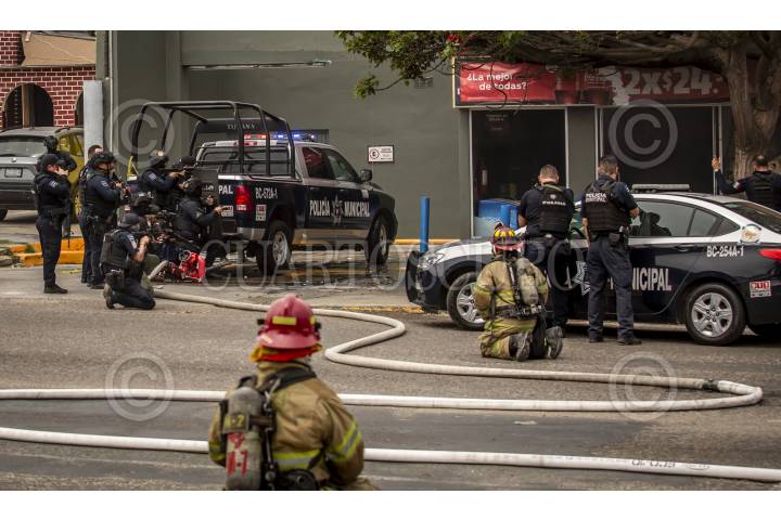 TIJUANA, BAJA CALIFORNIA,27JULIO2021.- Fuerte movilización policiaca se registró en Tijuana después que un hombre incendió un establecimiento de la tienda Oxxo. Elementos del cuerpo de bomberos acudieron al lugar para sofocar el llamas, mientras que agentes de distintas corporaciones intentaban detener al presunto culpable que se perpetró en el interior de la tienda de autoservicio, misma que se ubica en la avenida Pedregal, del fraccionamiento Playas de Tijuana. Tras varios minutos de dialogo con un grupo especial de la Policía Municipal, el hombre se entregó y posteriormente fue detenido. FOTO: OMAR MARTÍNEZ /CUARTOSCURO.COM