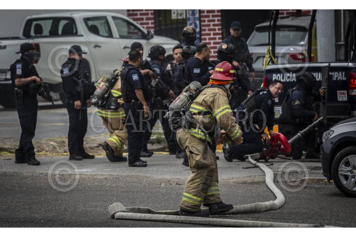TIJUANA, BAJA CALIFORNIA,27JULIO2021.- Fuerte movilización policiaca se registró en Tijuana después que un hombre incendió un establecimiento de la tienda Oxxo. Elementos del cuerpo de bomberos acudieron al lugar para sofocar el llamas, mientras que agentes de distintas corporaciones intentaban detener al presunto culpable que se perpetró en el interior de la tienda de autoservicio, misma que se ubica en la avenida Pedregal, del fraccionamiento Playas de Tijuana. Tras varios minutos de dialogo con un grupo especial de la Policía Municipal, el hombre se entregó y posteriormente fue detenido. FOTO: OMAR MARTÍNEZ /CUARTOSCURO.COM