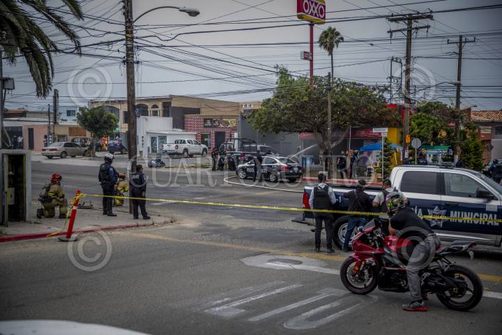 TIJUANA, BAJA CALIFORNIA,27JULIO2021.- Fuerte movilización policiaca se registró en Tijuana después que un hombre incendió un establecimiento de la tienda Oxxo. Elementos del cuerpo de bomberos acudieron al lugar para sofocar el llamas, mientras que agentes de distintas corporaciones intentaban detener al presunto culpable que se perpetró en el interior de la tienda de autoservicio, misma que se ubica en la avenida Pedregal, del fraccionamiento Playas de Tijuana. Tras varios minutos de dialogo con un grupo especial de la Policía Municipal, el hombre se entregó y posteriormente fue detenido. FOTO: OMAR MARTÍNEZ /CUARTOSCURO.COM