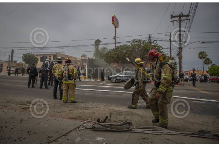 TIJUANA, BAJA CALIFORNIA,27JULIO2021.- Fuerte movilización policiaca se registró en Tijuana después que un hombre incendió un establecimiento de la tienda Oxxo. Elementos del cuerpo de bomberos acudieron al lugar para sofocar el llamas, mientras que agentes de distintas corporaciones intentaban detener al presunto culpable que se perpetró en el interior de la tienda de autoservicio, misma que se ubica en la avenida Pedregal, del fraccionamiento Playas de Tijuana. Tras varios minutos de dialogo con un grupo especial de la Policía Municipal, el hombre se entregó y posteriormente fue detenido. FOTO: OMAR MARTÍNEZ /CUARTOSCURO.COM
