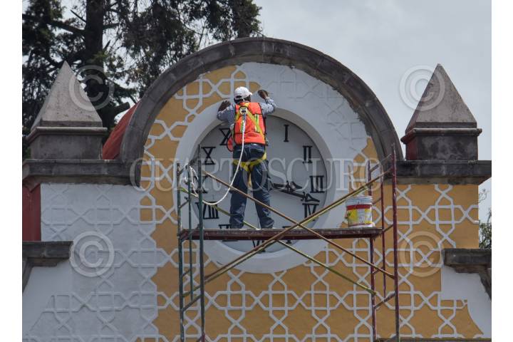 TOLUCA, ESTADO DE MÉXICO, 30JULIO2021.- Trabajadores realizan la pinta de la fachada de la Secundaria núm. 1 Miguel Hidalgo, en la zona centro de Toluca, poniendo mucho cuidado en el reloj que se encuentra en esta institución. FOTO: CRISANTA ESPINOSA AGUILAR /CUARTOSCURO.COM
