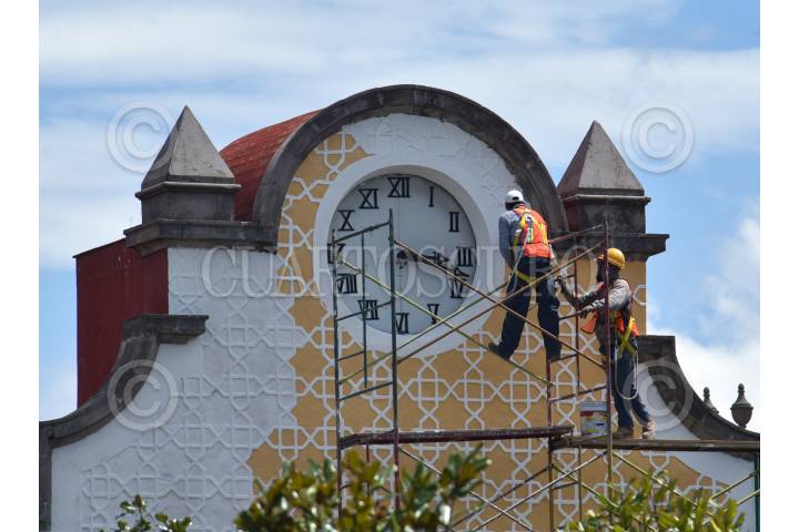 TOLUCA, ESTADO DE MÉXICO, 30JULIO2021.- Trabajadores realizan la pinta de la fachada de la Secundaria núm. 1 Miguel Hidalgo, en la zona centro de Toluca, poniendo mucho cuidado en el reloj que se encuentra en esta institución. FOTO: CRISANTA ESPINOSA AGUILAR /CUARTOSCURO.COM