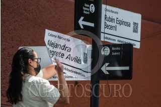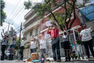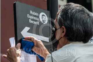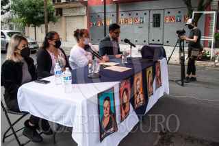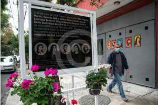 CIUDAD DE MÉXICO, 31JULIO2021.- Patricia Espinosa, hermana de Rubén Espinosa; Gabriela Mejía, hija de Alejandra Negrete; Indira Blanco, madre de Yesenia Quiroz, y Leopoldo Maldonado, director regional de Artículo 19, realizaron una conferencia y homenaje simbólico al exterior del departamento número 1909 en Luz Saviñón de la colonia Narvarte a seis años del multihomicidio donde perdieron la vida el periodista Rubén Espinosa Becerril, la modelo colombiana Mile Virginia Martín, la trabajadora doméstica Olivia Alejandra Negrete Avilés, la estudiante de belleza Atziry Yesenia Quiroz Alfaro y la defensora de derechos humanos Nadia Dominique Vera Pérez. FOTO: MARIO JASSO/CUARTOSCURO.COM