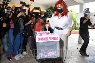 CAMPECHE, CAMPECHE, 01AGOSTO2021.- La gobernadora electa, Layda Sansores San Román, depositó su voto esta mañana en la Consulta Popular 2021, para enjuiciar a los Ex Presidentes de México. La morenistas acudió a la casilla instalada en la Escuela Primaria “Héctor Pérez Martínez” ubicada en la calle 14 del barrio de San Francisco de Campeche. Sansores San Román lamentó que el Instituto Nacional Electoral (INE) no haya dado las facilidades adecuadas para este nuevo ejercicio ciudadano ya que no se respetó la ubicación de las casillas y eso generó incertidumbre entre los ciudadanos que acudieron a depositar su voto. FOTO: MICHAEL BALAM/CUARTOSCURO.COM