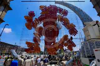 CIUDAD DE MÉXICO, 01AGOSTO2021.- Como parte de las conmemoraciones de los 500 años de Resistencia Indígena en la Ciudad de México, la Secretaría de Obras y Servicios realiza la instalación del alumbrado decorativo que vestirá el Zócalo capitalino. La decoración consiste en cuatro conjuntos luminosos que estarán listos para el 13 de agosto. En su elaboración participan 111 trabajadores de la Dirección General de Servicios Urbanos. Además, con el fin de optimizar los recursos de la Ciudad, las decoraciones son fabricadas con materiales reciclados de años anteriores. Finalmente, la iluminación decorativa estará conformada entre otros, por un conjunto tridimensional de Coyolxauhqui, Diosa de la Luna; los cuales se montan en los edificios de Gobierno, y las calles principales que convergen en el Zócalo de la Ciudad de México. FOTO: SOBSE/CUARTOSCURO.COM