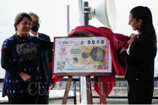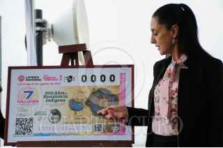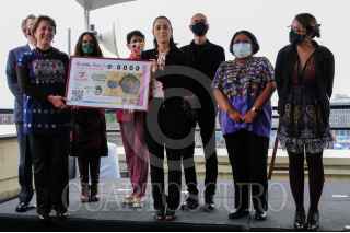 CIUDAD DE MÉXICO, 03AGOSTO2021.- Claudia Sheinbaum, jefa de gobierno de la capital, en compañía de Margarita González Saravia, directora de la Lotería Nacional y distintas autoridades de gobierno de la ciudad, develaron el boleto de lotería en conmemoración por los 500 Años de la Resistencia Indígena. Esto como parte de los festejos de dicho aniversario. FOTO: DANIEL AUGUSTO /CUARTOSCURO.COM