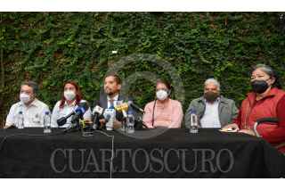 CIUDAD DE MÉXICO, 03AGOSTO2021.- Teófilo Benítez, abogado junto a: Rigoberto Quiroz; Marisol Tapia; Jocabed Pineda y Adriana Galván, familiares afectados por el accidente ocurrido en el tramo elevado del metro de línea 12, ofrecieron conferencia de prensa prensa para exigir justicia y demandaron no recibir apoyo por parte de las autoridades a tres meses de sucedidos los hechos. FOTO: MARIO JASSO/CUARTOSCURO.COM