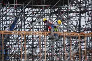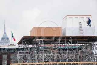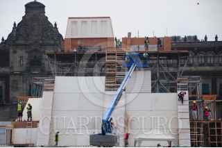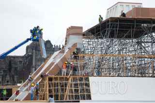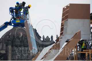 CIUDAD DE MÉXICO, 03AGOSTO2021.- Trabajadores de la Secretaría de Obras de la capital del país continúan armando la maqueta de una pirámide que fungirá como el principal atractivo para conmemorar los 500 años de Resistencia Indígena el próximo 13 de agosto. La construcción está ubicada sobre la plancha del Zócalo capitalino. FOTO: DANIEL AUGUSTO /CUARTOSCURO.COM