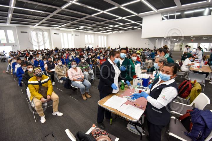 TOLUCA, ESTADO DE MÉXICO, 06AGOSTO2021.- Este viernes concluyó la vacunación para trabajadores de 18 a 29 años de edad, aplicándoles la vacuna contra COVID-19 de SINOVAC, como parte de un programa especial dirigido a los trabajadores afiliados al IMSS, en las últimas dos semanas se han vacunado cerca de 73 mil trabajadores en la entidad mexiquense; recibieron la primera dosis del biológico del Centro de Convenciones y Exposiciones Toluca, los trabajadores fueron transportados en camiones desde sus empresas y regresaron a su lugar de origen vacunados. FOTO: CRISANTA ESPINOSA AGUILAR /CUARTOSCURO.COM