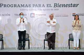COLIMA, COLIMA, 07AGOSTO2021.- Andrés Manuel López Obrador, Presidente Constitucional de los Estados Unidos Mexicanos, encabezó la presentación de Programas para el Bienestar en el Auditorio Multifuncional, Unidad Deportiva Morelos de Colima. Lo acompañaron Pamela López Ruiz, Directora General del Programa "La Escuela es Nuestra"; Marath Baruch Bolaños López, Subsecretario de Empleo y Productividad Laboral de la Secretaría del Trabajo y Previsión Social; Hugo Raúl Paulín Hernández, Subsecretario de Inclusión Productiva y Desarrollo Rural; José Ignacio Peralta Sánchez, Gobernador Constitucional del Estado de Colima; Ariadna Montiel Reyes, Subsecretaria de Bienestar; Gobernadora Electa del Estado de Colima, Indira Vizcaíno Silva y Abraham Vázquez Piceno, Coordinador Nacional del Programa de Becas para el Bienestar "Benito Juárez". FOTO: PRESIDENCIA /CUARTOSCURO.COM
