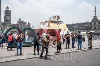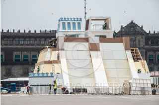 CIUDAD DE MÉXICO, 07AGOSTO2021.- Continúan los trabajos de construcción de la maqueta monumental "Huey Teocalli" en la plancha del Zócalo capitalino, con motivo de la conmemoración de los 500 años de la Resistencia Indígena en México-Tenochtitlán. FOTO: MARIO JASSO/CUARTOSCURO.COM