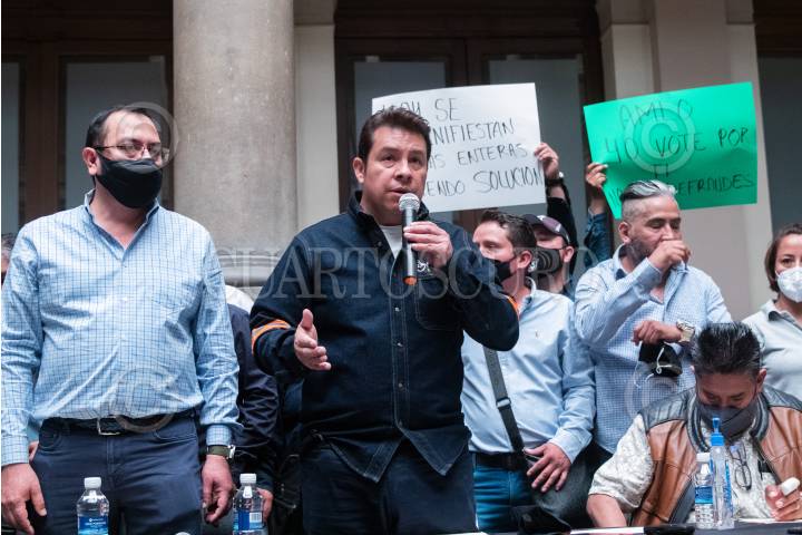 CIUDAD DE MÉXICO, 11AGOSTO2021.- Repartidores de gas LP que integran el Gremio Gasero Nacional, encabezados por su líder Adrián Rodríguez, ofrecieron una rueda de prensa para hablar que la medida del gobierno federal de topar el precio del energético implica pérdidas en sus ganancias, ya que actualmente señalan que solo ganan 50 centavos por litro que venden. Los afectados se reunieron en el Club de Periodistas y tras ofrecer una rueda de prensa se dirigieron en marcha rumbo al Zócalo donde fueron interceptados por granaderos en 5 de Mayo y Palma. FOTO: MOISÉS PABLO/CUARTOSCURO.COM