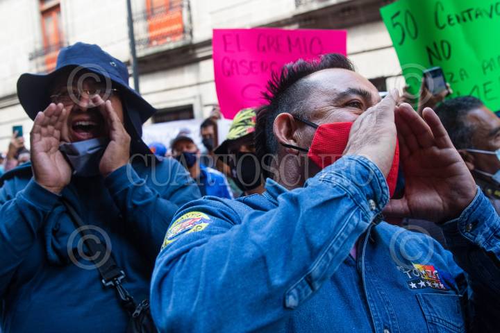 CIUDAD DE MÉXICO, 11AGOSTO2021.- Repartidores de gas LP que integran el Gremio Gasero Nacional, encabezados por su líder Adrián Rodríguez, ofrecieron una rueda de prensa para hablar que la medida del gobierno federal de topar el precio del energético implica pérdidas en sus ganancias, ya que actualmente señalan que solo ganan 50 centavos por litro que venden. Los afectados se reunieron en el Club de Periodistas y tras ofrecer una rueda de prensa se dirigieron en marcha rumbo al Zócalo donde fueron interceptados por granaderos en 5 de Mayo y Palma. FOTO: MOISÉS PABLO/CUARTOSCURO.COM