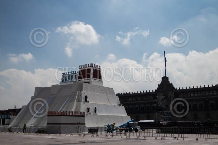 CIUDAD DE MÉXICO, 11AGOSTO2021.- Como parte de la conmemoración del 500 aniversario de la caída de Tenochtitlán se está construyendo una representación gigantesca del Templo Mayor en pleno Zócalo. Tiene una altura aproximada de 16 metros y casi 675 metros cuadrados de superficie. Está construida, principalmente, con tubería para la estructura, con algunos materiales plásticos reciclados y detalles en fibra de vidrio. Esta construcción ha causado polémica en redes sociales ya que por granizadas y lluvias el verdadero sitio prehispánico se encuentra cerrado al público porque no han podido reparar los daños causados desde hace cerca de 4 meses. FOTO: ANDREA MURCIA /CUARTOSCURO.COM
