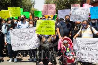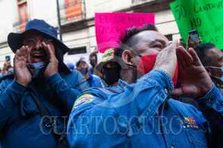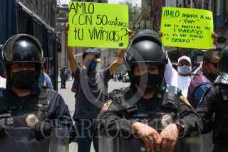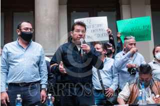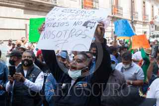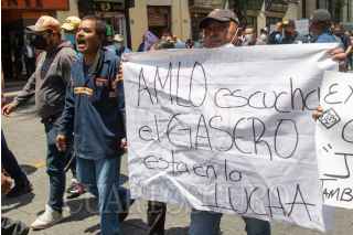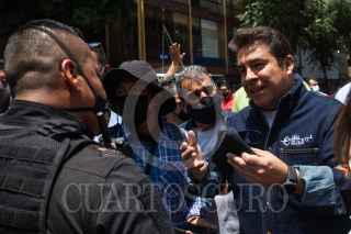 CIUDAD DE MÉXICO, 11AGOSTO2021.- Repartidores de gas LP que integran el Gremio Gasero Nacional, encabezados por su líder Adrián Rodríguez, ofrecieron una rueda de prensa para hablar que la medida del gobierno federal de topar el precio del energético implica pérdidas en sus ganancias, ya que actualmente señalan que solo ganan 50 centavos por litro que venden. Los afectados se reunieron en el Club de Periodistas y tras ofrecer una rueda de prensa se dirigieron en marcha rumbo al Zócalo donde fueron interceptados por granaderos en 5 de Mayo y Palma. FOTO: MOISÉS PABLO/CUARTOSCURO.COM