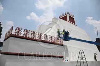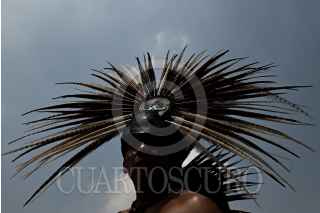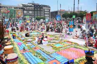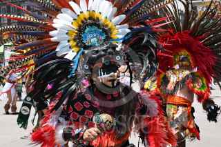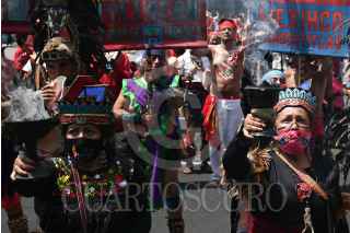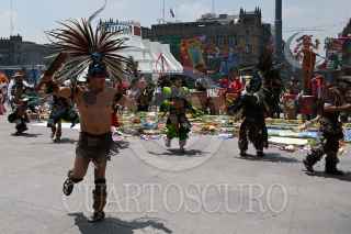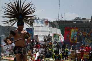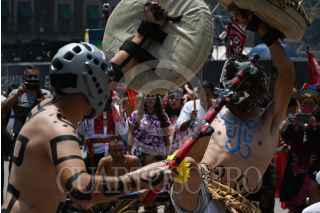 CIUDAD DE MÉXICO, 12AGOSTO2021.- Cientos de danzantes se dieron cita en la explanada del Zócalo capitalino para conmemorar los 500 años de la defensa de Tenochtitlán a celebrarse este próximo viernes. Con el saludo a los 4 puntos cardinales y la bendición de los bastones de mando y danzas iniciaron las celebraciones. FOTO: DANIEL AUGUSTO /CUARTOSCURO.COM