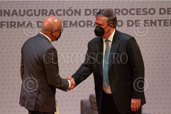 CIUDAD DE MÉXICO, 13AGOSTO2021.- Jorge Rodríguez, presidente de la Asamblea Nacional de Venezuela; Marcelo Ebrard, secretario de Relaciones Exteriores; Dag Nylander, director del Centro noruego de Resolución de conflictos, y Gerardo Blyde Pérez, representante de la delegación opositora de Venezuela, encabezaron la Inauguración del proceso de negociación y diálogo, y firma de memorando de entendimiento de Venezuela, realizado en el Museo de Antropología e Historia. FOTO: GRACIELA LÓPEZ /CUARTOSCURO.COM