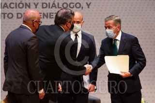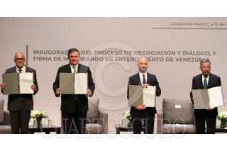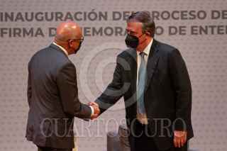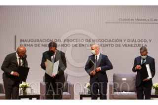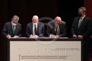 CIUDAD DE MÉXICO, 13AGOSTO2021.- Jorge Rodríguez, presidente de la Asamblea Nacional de Venezuela; Marcelo Ebrard, secretario de Relaciones Exteriores; Dag Nylander, director del Centro noruego de Resolución de conflictos, y Gerardo Blyde Pérez, representante de la delegación opositora de Venezuela, encabezaron la Inauguración del proceso de negociación y diálogo, y firma de memorando de entendimiento de Venezuela, realizado en el Museo de Antropología e Historia. FOTO: GRACIELA LÓPEZ /CUARTOSCURO.COM