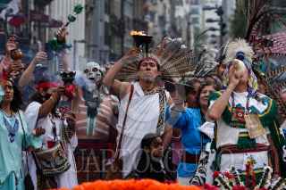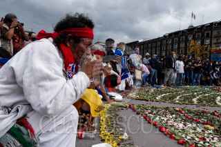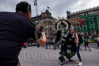 CIUDAD DE MÉXICO, 13AGOSTO2021.- Con muestras de danza, toque de tambores, juegos de pelota, simulación de batalla y personificaciones, docenas de integrantes de grupos de danza prehispánica se reunieron en el Zócalo capitalino, donde esta mañana el presidente Andrés Manuel López Obrador inauguró oficialmente la maqueta monumental con motivo de los “500 años de Resistencia Indígena”. Esta noche, será presentado el show de luces en la edificación en forma de pirámide que se mantendrá en la plancha hasta el 1 de septiembre del presente año. FOTO: GALO CAÑAS/CUARTOSCURO.COM