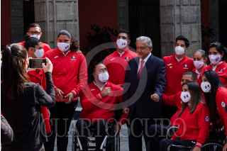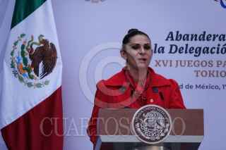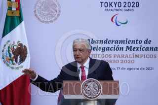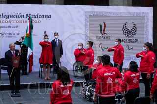 CIUDAD DE MÉXICO, 17AGOSTO2021.- Andrés Manuel López Obrador, presidente de México; Claudia Sheinbaum, jefa de gobierno de la Ciudad de México; Ana Gabriela Guevara, titular de la Comisión Nacional del Deporte (CONADE); los secretario de Marina y SEDENA, Rafael Ojeda y Luis Cresencio Sandoval encabezaron el abanderamientos de la federación mexicana que participará en los Juegos Paralímpicos de Tokio 2021. FOTO: GALO CAÑAS/CUARTOSCURO.COM