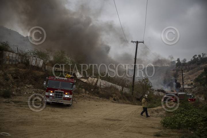 TIJUANA, BAJA CALIFORNIA,17AGOSTO2021.- Tres estaciones de bomberos trabajaron esta tarde en mitigar un fuerte incendio registrado en un domicilio ubicado en el Cañón del Alacrán de la colonia San Ángel. De acuerdo con información oficial, se recibió el reporte de incendio de basura que después consumió una casa y automóviles que estaban abandonados en el lugar. No se reportaron lesionados. FOTO: OMAR MARTÍNEZ /CUARTOSCURO.COM