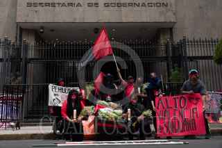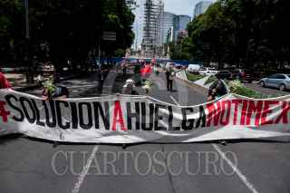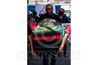 CIUDAD DE MÉXICO, 20AGOSTO2021.- Con motivo del 53 aniversario de la creación de la Agencia de Noticias del Estado Mexicano (Notimex), integrantes del Sindicato Único de Trabajadores de Notimex (SutNotimex) que desde hace más de un año mantienen una huelga contra la directora Sanjuana Martínez por los despidos y nulos pagos tras adquirir el cargo. Cargado un ataúd, pancartas y banderas rojinegras los inconformes marcharon del Ángel de la Independencia a la Secretaría de Gobernación. FOTO: GALO CAÑAS/CUARTOSCURO.COM