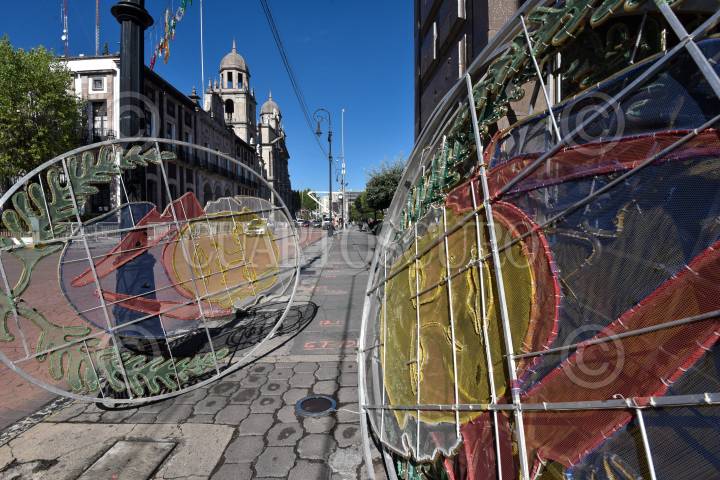 TOLUCA, ESTADO DE MÉXICO, 23AGOSTO2021.- Trabajadores iniciaron la colocación de adornos patrios en el centro Toluca, adornos que han sido utilizados en años anteriores y ya se ven algunos rasgados. FOTO: CRISANTA ESPINOSA AGUILAR AGUILAR /CUARTOSCURO.COM