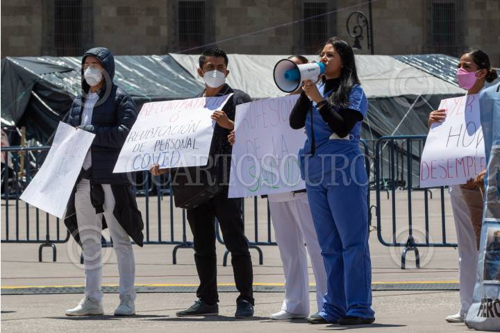 CIUDAD DE MÉXICO, 18AGOSTO2021.- Personal de salud de Juchitán, Oaxaca, se manifestó en el Zócalo ya que señalan que autoridades sanitarias de aquella entidad les ha negado su basificación, ellos fueron contratados en el marco de la crisis sanitaria por la pandemia de Covid-19, denuncian que ahora que se les niega seguridad laboral a pesar de arriesgar su vida en la atención de pacientes con esta enfermedad. FOTO: MOISÉS PABLO/CUARTOSCURO.COM