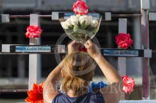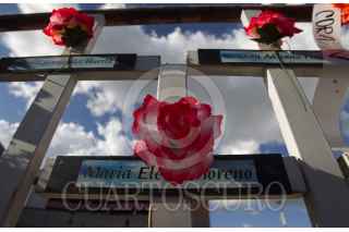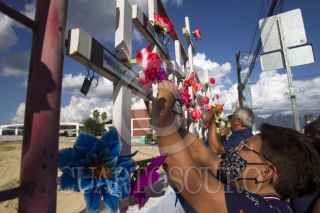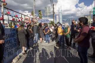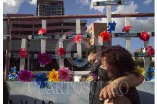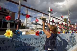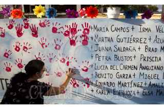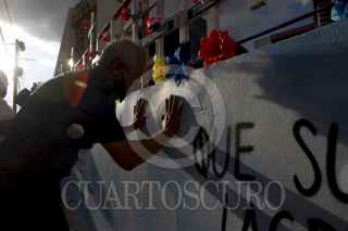 MONTERREY, NUEVO LEÓN, 25AGOSTO2021.- Familiares de víctimas del ataque al Casino Royale, donde murieron 52 personas, se reunieron en conmemoración del décimo aniversario donde colocaron flores y pintaron sus manos en el muro exterior exigiendo justicia para los deudos y sus familias. FOTO: GABRIELA PÉREZ MONTIEL / CUARTOSCURO.COM