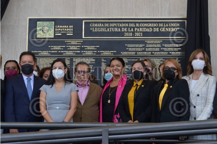 CIUDAD DE MÉXICO, 26AGOSTO2021.- Ignacio Mier, diputado y coordinador de Morena; Porfirio Muñoz Ledo, diputado de Morena; Laura Angélica Rojas, diputada del PAN; Dulce María Sauri, presidenta de la mesa directiva de la Cámara de Diputados, y Verónica Juárez Piña, diputada y coordinadora del PRD, encabezaron la develación de la placa alusiva a la LXIV Legislatura de la Cámara de Diputados "Paridad de Género". FOTO: MARIO JASSO/CUARTOSCURO.COM