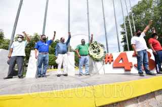 CHILPANCINGO, GUERRERO, 26AGOSTO2021.- A un mes de cumplirse siete años de la desaparición de los 43 estudiantes, Ayotzinapa y organizaciones sociales se pronunciaron nuevamente por la presentación con vida y justicia para los asesinados. Durante un mítin en el antimonumento, el representante del Colectivo Los Olvidados de Ayotzinapa, pidió guardar un minuto de silencio por el señor Saúl Bruno Rosario, padre de Saúl Bruno García, uno de los 43 estudiantes desaparecidos, quien hace unos días perdió la vida a causa de una enfermedad. Señaló que ya son tres los padres que mueren sin ver a sus hijos, primero fue la madre Minerva Bello, le siguió don Tomás Ramírez y ahora don Saúl Bruno, esperando justicia, la cual ni siquiera el presente gobierno les pudo garantizar. Freddy Gutiérrez Mayo, miembro de la Comisión Política de la CETEG exigió al gobierno de Andrés Manuel López Obrador a que cumpla sus compromisos de campaña con el Colectivo de los Padres y Madres de los 43 estudiantes desaparecidos, Justicia y Verdad. Asimismo, dijo que lejos de apoyar a la educación y al normalismo, este gobierno sigue golpeando, el ejemplo es la disminución de su presupuesto, apostando a la desaparición de las normales rurales.