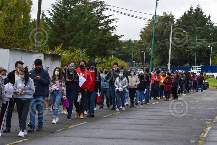 TOLUCA, ESTADO DE MÉXICO, 28AGOSTO2021.- Jóvenes de 18 a 29 años de edad acudieron a temprana hora a los centros de vacunación instalados en 4 puntos en la ciudad de Toluca para recibir la primera dosis de la vacuna contra COVID-19 de Moderna; no importaron la condiciones climáticas, se observaron largas filas. FOTO: CRISANTA ESPINOSA AGUILAR /CUARTOSCURO.COM