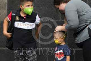 CIUDAD DE MÉXICO, 29AGOSTO2021.- Una madre de familia le coloca un cubrebocas a su hijo en la calle de Pino Suárez. FOTO: MOISÉS PABLO/CUARTOSCURO.COM