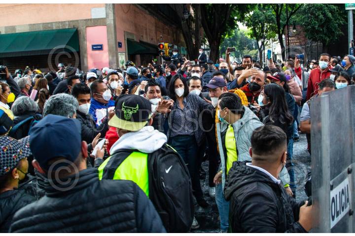 CIUDAD DE MÉXICO, 30AGOSTO2021.- La Unión de alcaldes y alcaldesas, quienes habían convocado a conferencia de prensa en el Congreso de la Ciudad de México, se enfrentaron a policías de la capital que mantenían un operativo de seguridad en las inmediaciones del inmueble. La alcaldesa electa de Álvaro Obregón, Lía Limón, resultó con una lesión en la nariz. FOTO: CUARTOSCURO.COM