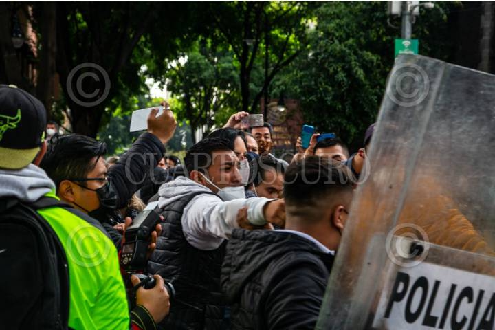 CIUDAD DE MÉXICO, 30AGOSTO2021.- La Unión de alcaldes y alcaldesas, quienes habían convocado a conferencia de prensa en el Congreso de la Ciudad de México, se enfrentaron a policías de la capital que mantenían un operativo de seguridad en las inmediaciones del inmueble. La alcaldesa electa de Álvaro Obregón, Lía Limón, resultó con una lesión en la nariz. FOTO: CUARTOSCURO.COM