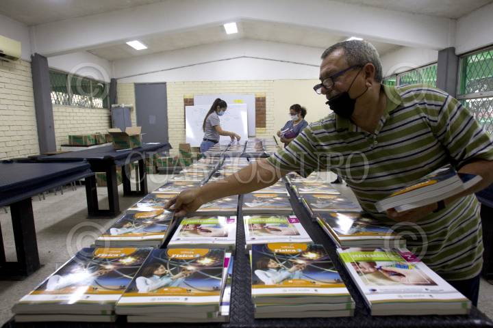 MONTERREY, NUEVO LEÓN, 30AGOSTO2021.- En Nuevo León, solo el 3% de las escuelas regresó a clases presenciales, en su mayoría estancias infantiles y nivel preescolar, en algunos casos con ausencia de alumnado, el resto continuó con clases a distancia. Los maestros organizan libros de texto para ser entregados a los padres de familia. FOTO: GABRIELA PÉREZ MONTIEL / CUARTOSCURO.COM