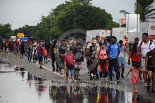 MAPASTEPEC, CHIAPAS, 31AGOSTO2021.- El segundo bloque de la caravana migrante pasa caminando por una subestación de la Guardia Nacional. Bajo la lluvias los caminantes persisten seguir su camino rumbo los Estados Unidos. Las personas se observa cansadas, tras más de 16 horas de caminar desde el municipio de Huixtla. FOTO: DAMIÁN SÁNCHEZ/CUARTOSCURO.COM