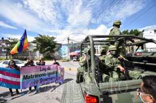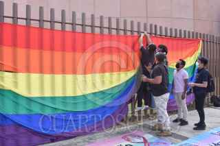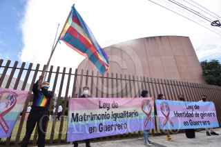 CHILPANCINGO, GUERRERO, 01SEPTIEMBRE2021.- Activistas de la comunidad LGBTTTI se manifestaron en el Congreso del Estado, en el marco de la instalación LXIII Legislatura, para reclamar a los y las diputadas salientes que no aprobaran el matrimonio igualitario durante su periodo. Alrededor de las 10:30 de la mañana, integrantes de distintos colectivos LGBTTTI se reunieron afuera de la explanada del Congreso, ubicado al sur de la ciudad. Los manifestantes portaban lonas y banderas con los colores distintivos de la lucha por la defensa de los derechos de la comunidad. También contenían mensajes como «No más crímenes de odio en Guerrero», «Ley de Matrimonio igualitario en Guerrero» y «Ley de Identidad de Género en Guerrero.» En entrevista, el presidente del Colectivo LGBT Orgullo Guerrero, Juan Carlos Salvador López, detalló que la manifestación se llevó a cabo como «un reclamo» a los legisladores que no aprobaron la Ley del Matrimonio igualitario en el estado, debido a que la mayoría votó en contra. FOTO: DASSAEV TÉLLEZ ADAME/CUARTOSCURO.COM