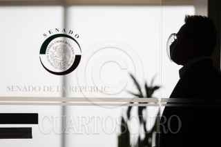 CIUDAD DE MÉXICO, 02SEPTIEMBRE2021.- Personal de resguardo parlamentario con careta y cubrebocas en una de las puertas restringidas al paso en el Senado de la República. FOTO: MOISÉS PABLO/CUARTOSCURO.COM