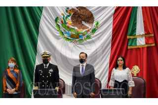 XALAPA, VERACRUZ. 03SEPTIEMBRE2021.- El comandante de la Primera Región Naval, Almirante Santiago Morgado Gómez, como representante del Almirante secretario de la Marina, Rafael Ojeda Durán, reafirmó el compromiso del Ejército de servir a los veracruzanos al hablar en la tribuna del Congreso como parte de la Sesión Solemne para inscribir con letras de oro la leyenda "2021 Bicentenario de la creación de la Armada de México". Acto que encabezó el Gobernador, Cuitláhuac García. FOTO: YERANIA ROLÓN/CUARTOSCURO.COM