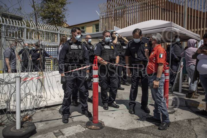TIJUANA, BAJA CALIFORNIA,03SEPTIEMBRE2021.- Una manifestación de migrantes que exigieron asilo político provocó el cierre temporal del cruce peatonal y la línea Sentri de la garita internacional de San Ysidro durante la tarde de este viernes. El cierre se registró cuando un grupo de aproximadamente 100 personas acudió a la garita de San Ysidro, específicamente en la línea Sentri, y se formó para solicitar asilo político. El movimiento provocó que agentes del CBP detuvieran operaciones en la línea Sentri y cruce peatonal, lo que tuvo como resultado esperas mayores a cinco horas para personas que buscaban cruzar a Estados Unidos. Tres migrantes fueron detenidos por la Policía Municipal de Tijuana. FOTO: OMAR MARTÍNEZ /CUARTOSCURO.COM