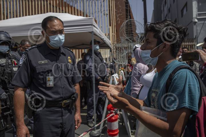 TIJUANA, BAJA CALIFORNIA,03SEPTIEMBRE2021.- Una manifestación de migrantes que exigieron asilo político provocó el cierre temporal del cruce peatonal y la línea Sentri de la garita internacional de San Ysidro durante la tarde de este viernes. El cierre se registró cuando un grupo de aproximadamente 100 personas acudió a la garita de San Ysidro, específicamente en la línea Sentri, y se formó para solicitar asilo político. El movimiento provocó que agentes del CBP detuvieran operaciones en la línea Sentri y cruce peatonal, lo que tuvo como resultado esperas mayores a cinco horas para personas que buscaban cruzar a Estados Unidos. Tres migrantes fueron detenidos por la Policía Municipal de Tijuana. FOTO: OMAR MARTÍNEZ /CUARTOSCURO.COM