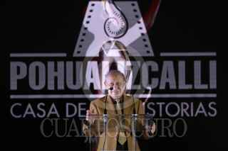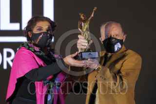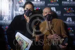 CIUDAD DE MÉXICO, 04SEPTIEMBRE2021.- Clara Brugada, alcaldesa de Iztapalapa, y Jesús Villaseca, director de la Escuela de Cine Comunitario y Fotografía "Pohualizcalli", encabezaron la celebración del Primer Aniversario de esta escuela en la explanada de la alcaldía Iztapalapa. Durante la ceremonia Clara Brugada, alcaldesa de Iztapalapa, entregó esculturas de un Cuitláhuac de Oro a los galardonados Arcelia Ramírez, actriz de cine y televisión, y al fotógrafo de nota roja Enrique Metinidés. FOTO: GRACIELA LÓPEZ / CUARTOSCURO.COM