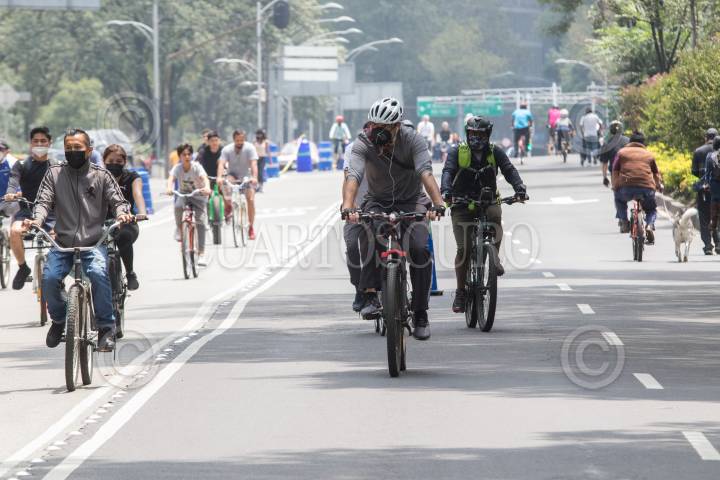 CIUDAD DE MÉXICO, 05SEPTIEMBRE2021.- Personas pasearon en bicicleta, patines o corriendo en el Paseo Ciclista en Paseo de la Reforma, algunos sin cubrebocas. Esta semana las autoridades sanitarias informaron que la ciudad pasará a semáforo amarillo de riesgo epidemiológico por el Covid-19, tras una reducción permanente de hospitalizaciones y casos positivos en las últimas tres semanas, luego de seis semanas consecutivas en color naranja. FOTO: MOISÉS PABLO/CUARTOSCURO.COM
