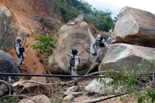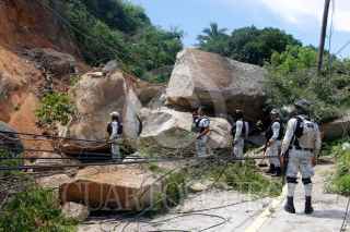 ACAPULCO, GUERRERO, 08SEPTIEMBRE2021.- Agentes de la Guardia Nacional y el Ejercito Mexicano retiraron árboles e inspeccionaron el área en donde un derrumbe bloqueo la avenida Gran Vía Tropical, tras el sismo del día de ayer de 7.1 grados. FOTO: CARLOS ALBERTO CARBAJAL/CUARTOSCURO.COM